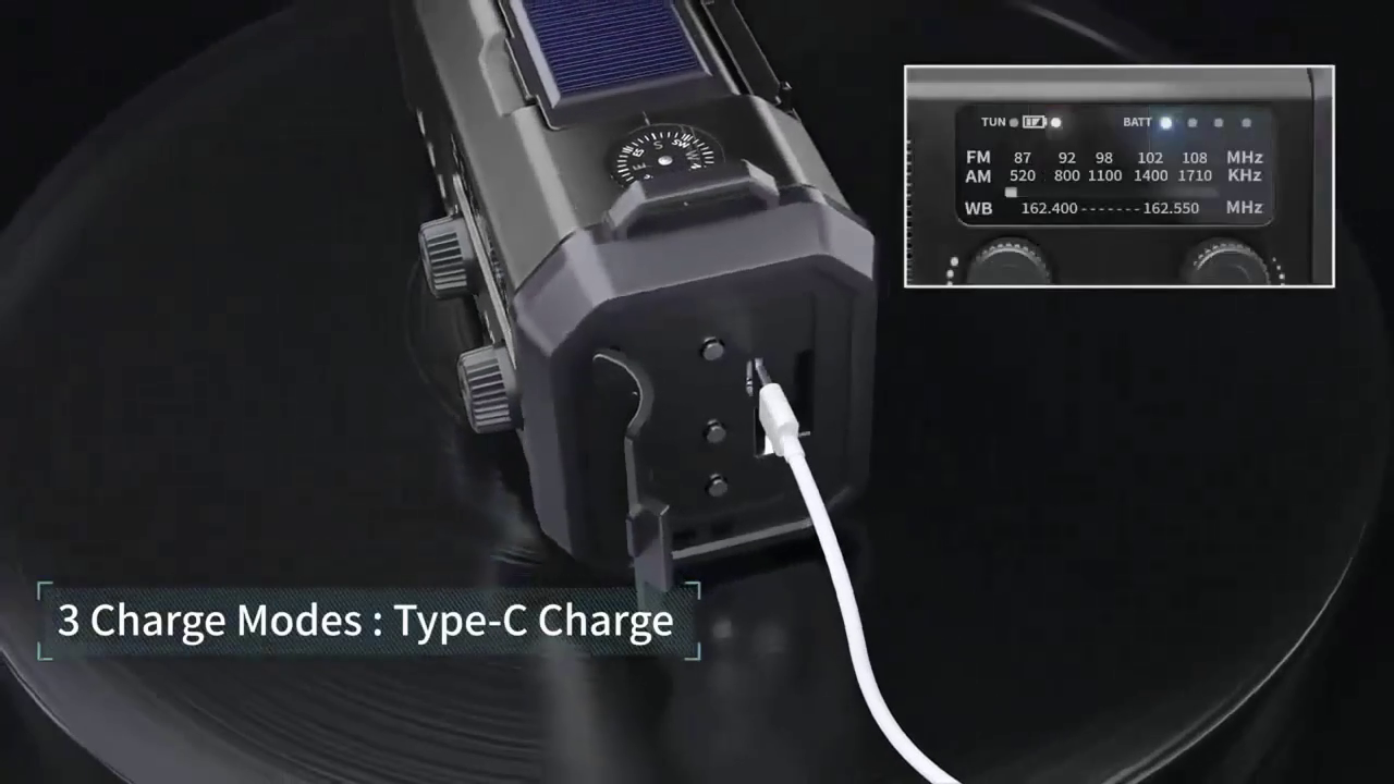 Use the included USB-C cable for fast charging. In emergencies, use the solar panel or the hand-crank dynamo.